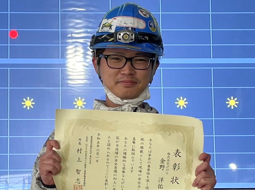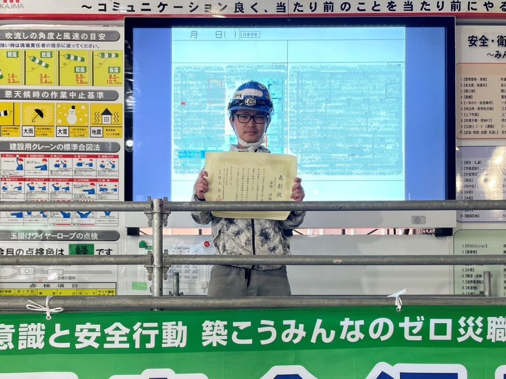 さて先日、鹿島建設㈱様のNTT仙台中央ビル作業所の安全大会にて、当社の金野洋佑さんが安全表彰を受賞致しました!
