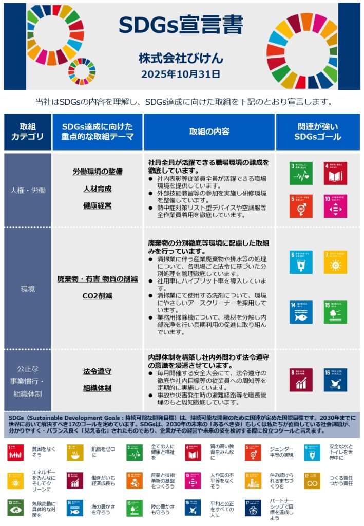 以上、宣言書の内容でしたが、このSDGs宣言を単なる言葉ではなく、日々の仕事の中で実践し継続していきたいと思います。この他にも様々なSDGsの取り組みがある中で、私たち㈱びけん一同は、このとても大きなテーマに臆することなく出来る事から一つ一つ積み上げ、2030年の近い未来を「あるべき姿」にするために取り組んで参ります。