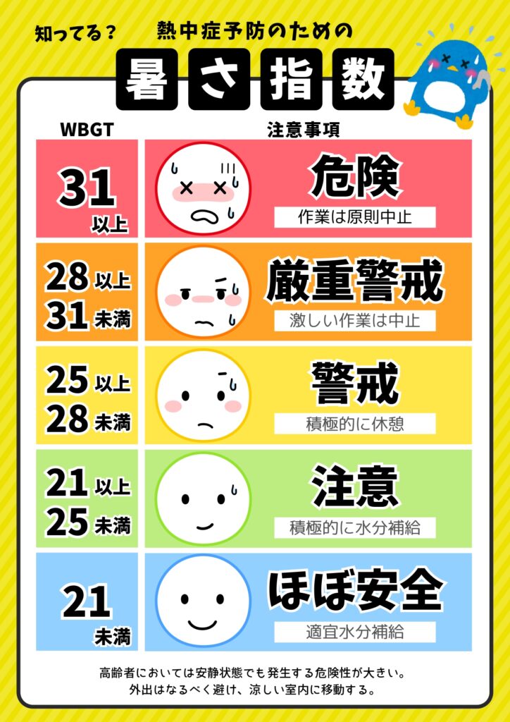 この熱中症警戒アラートとは、熱中症の危険性に対する「気づき」を促すことを目的として気象庁と環境省が共同で発表している情報で、現場では暑さ指数(WBGT)によって作業を続行するかどうかの判断をしています。